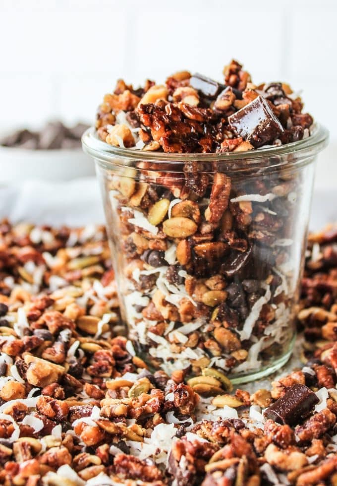 - Enjoy just as is for a quick snack. I leave it in a sealed container on the countertop for the kids and my husband to grab by the handful.