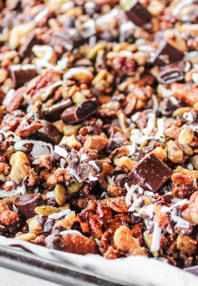 In a small bowl stir together maple syrup, melted coconut oil, and vanilla extract. Pour that over your nut and seed mixture. Spread in a single layer again.