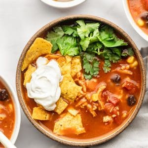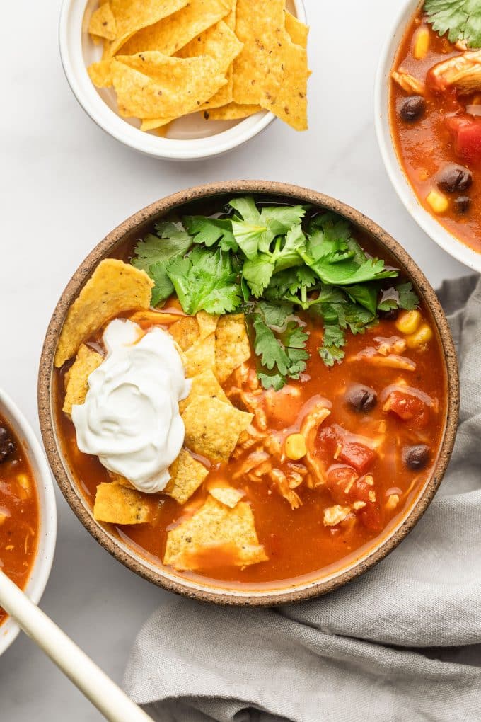 One of the best parts of a classic taco soup is that it includes lots of shelf stable ingredients. So if you have a craving for it or just need a super fast meal at the last minute, you can likely make it without running to the grocery store. In fact the only ingredient that’s not shelf stable is the chicken. I tend to keep chicken breasts in the freezer just for moments like this though.