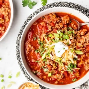 Want to enjoy this homemade turkey chili the next day or later in the week? It’s such a great option for meal prep. Leftover chili can be stored in an airtight container in the refrigerator for up to 5 days. Reheat on the stovetop on low to medium-low heat until warmed through.
