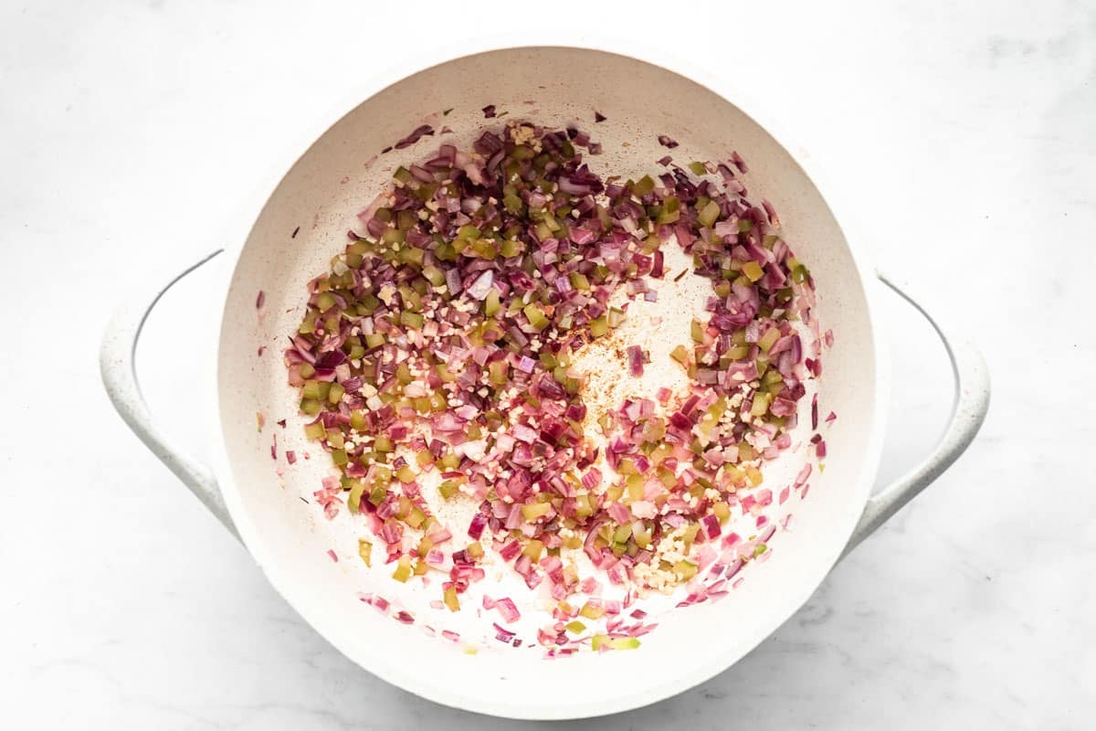 - Add oil to a large soup pot and heat to medium-high heat. Once hot, add onions and bell pepper. Sautรฉ until onion is translucent, approximately 3 minutes. Add minced garlic and sautรฉ until golden, about 1 minute.