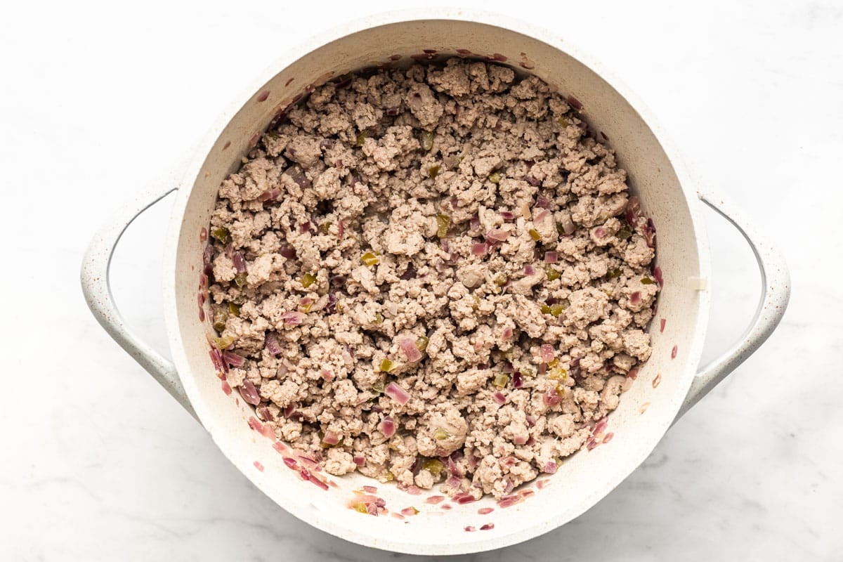 - Add the ground turkey, using your spatula to crumble it. Sautรฉ the meat, stirring occasionally, until no longer pink.