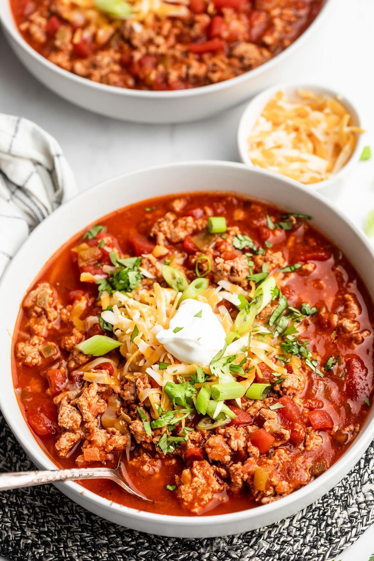 I love loading up my ground turkey chili with all kinds of toppings! Whether youโre enjoying this on a busy weeknight or a game day, the fun toppings add to the overall chili experience! If you’re entertaining guests I suggest creating a chili bar with an assortment of options. Here are some favorite toppings I suggest to dress up your bowl of chili.
