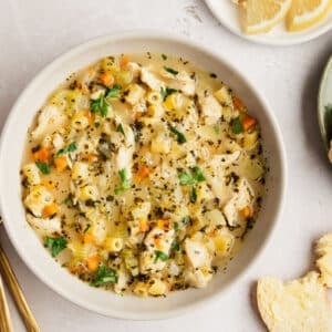 This creamy soup is a fun spin on the classic chicken noodle soup with a few tweaks to really make it extra special. Yes of course it’s loaded with tender chicken and pasta. But we’re opting for ditalini pasta instead of wide egg noodles. Ditalini pasta is small which I appreciate because it’s similar in size to our other ingredients. This means more balance and flavor in every bite! Another fun change is the addition of flour, milk, and parmesan to thicken our broth a bit. That creamy texture feels oh so cozy.