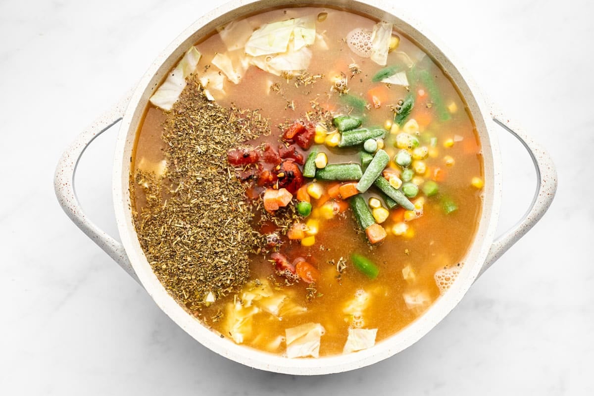 Reduce heat to simmer. Add the raw chicken breasts, mixed vegetables, chopped cabbage, canned diced tomatoes, Italian seasoning, salt, and pepper to the pot. Simmer until chicken is cooked through.