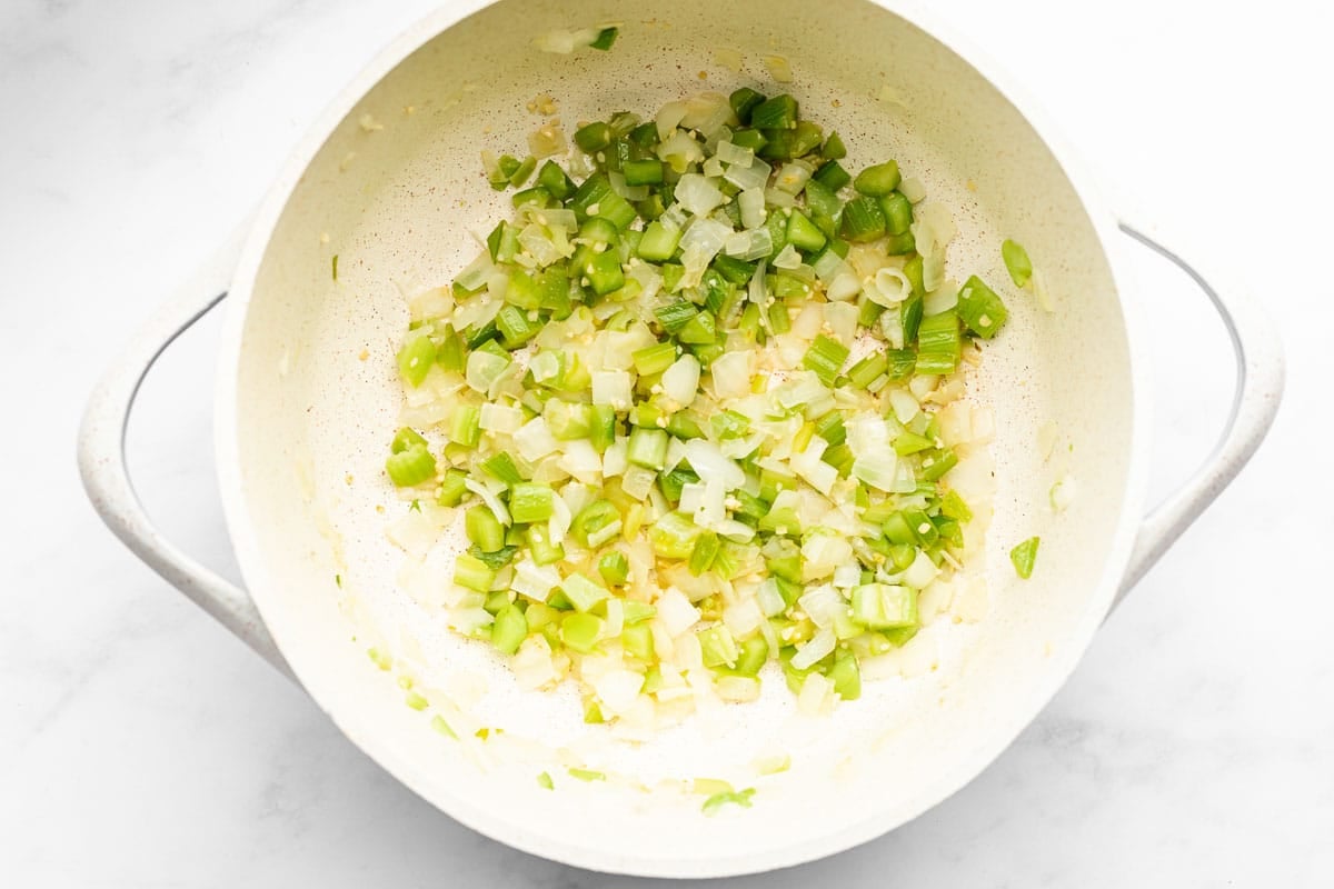 - Add oil, onion, and celery to a soup pot. Sautรฉ on medium high heat, stirring frequently, until onion is tender. Then add minced garlic and sautรฉ until golden in color, about one minute.