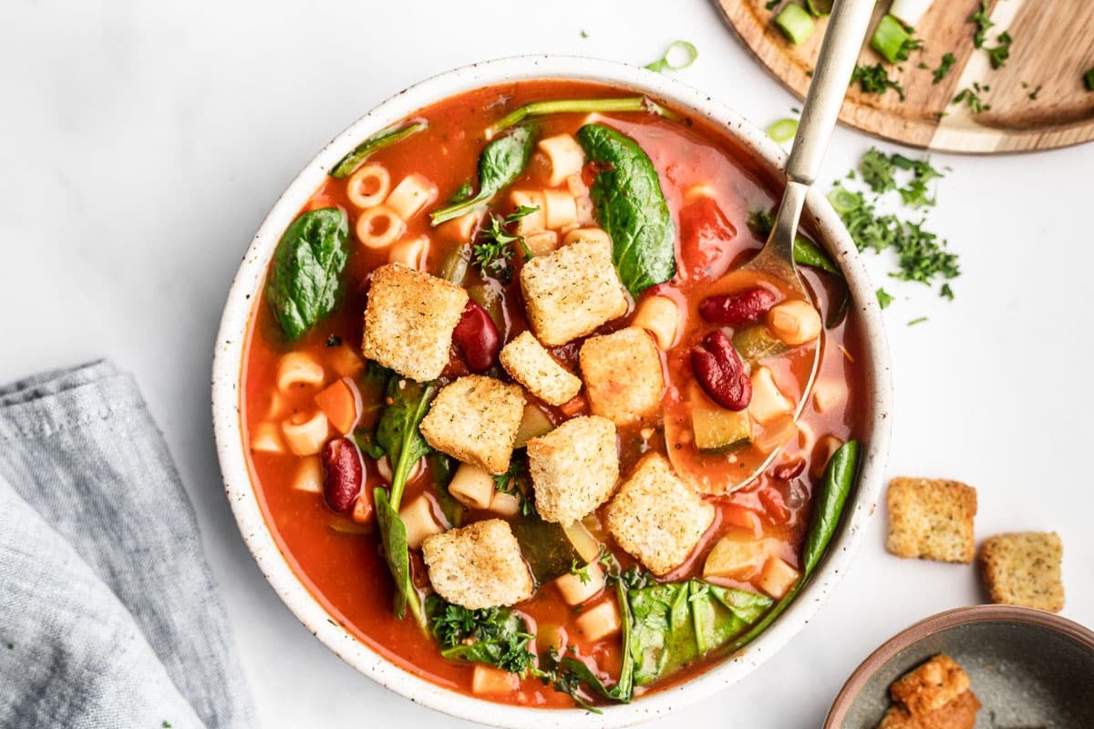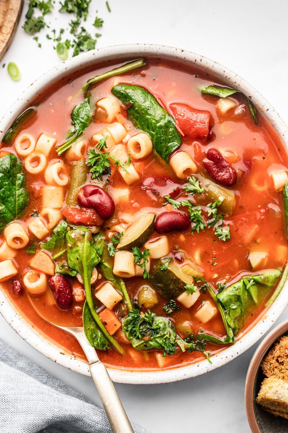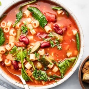 This delicious and easy minestrone soup is loaded with vegetables, noodles, a rich tomato broth, and beans. It’s vegetarian and ready in only 30 minutes!