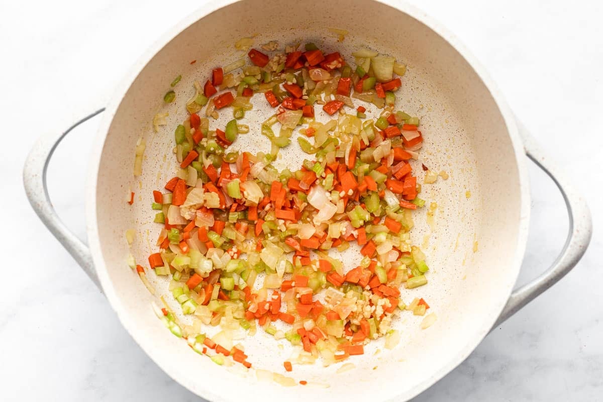 - Add oil, onion, celery, carrots to your soup pot. Sautรฉ on medium high heat, stirring frequently, until onion is tender. Add the minced garlic and sautรฉ until it is golden in color, about one minute.