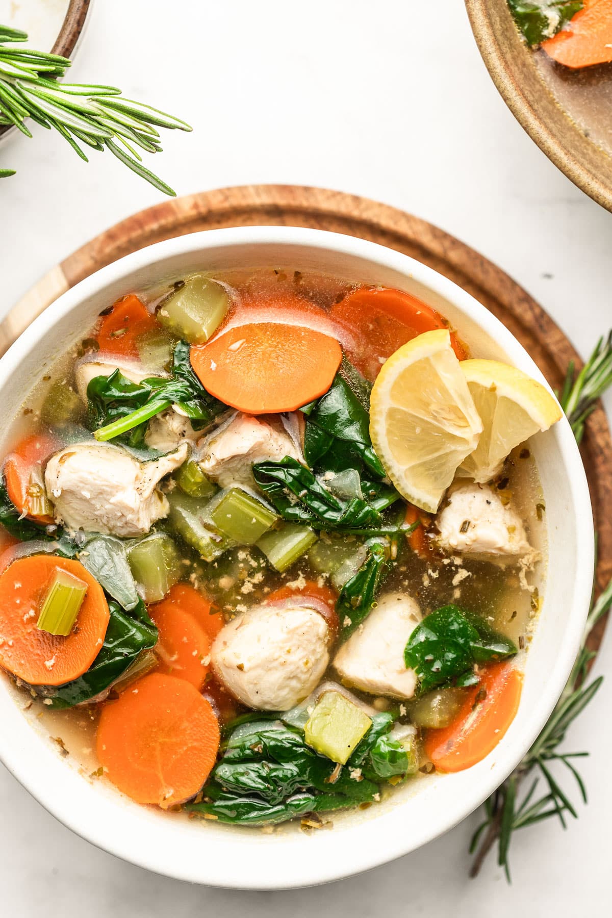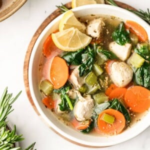 This is the best soup for cold winter nights! It’s a light brothy soup but loaded with so many yummy simple ingredients! Oh, you’re going to love the chunks of tender chicken, spinach, carrots, garlic, onion, and celery. Plus you’ll enjoy the amazing flavors of luscious lemon and herbs. It’s all my soupy dreams come to life. And while it doesn’t include noodles (who says chicken soup needs noodles anyway?) it does have plenty of fresh vegetables. Whether you’re on a low carb diet or not, you’re going to be a fan. This one is a family favorite in my home.