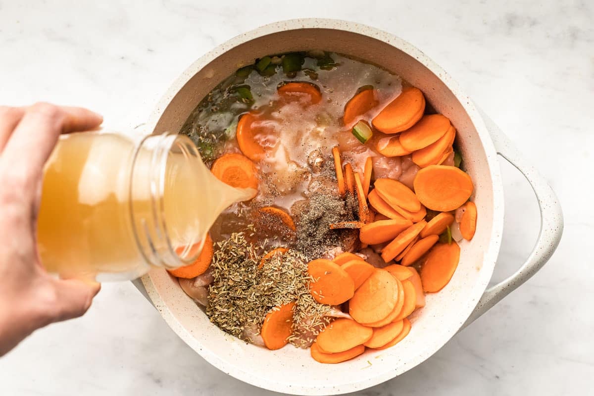 We’re adding raw chicken to this soup so that it adds even more flavor to your chicken stock (or broth) as it cooks. This is why we crank the heat up a bit in the beginning and then lower it.