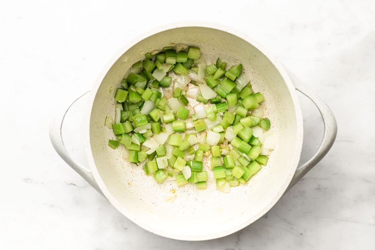 - Add your cooking fat of choice, onion, celery, and garlic to your soup pot. Sautรฉ on medium high heat, stirring frequently, until onion is tender and the garlic has a bit of browning.