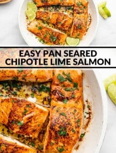 This pan seared salmon gets a beautifully golden crust while the inside is perfectly flaky. Plus it cooks in delicious chipotle and lime flavors. It’s a quick entree that’s ready in only 15 minutes!