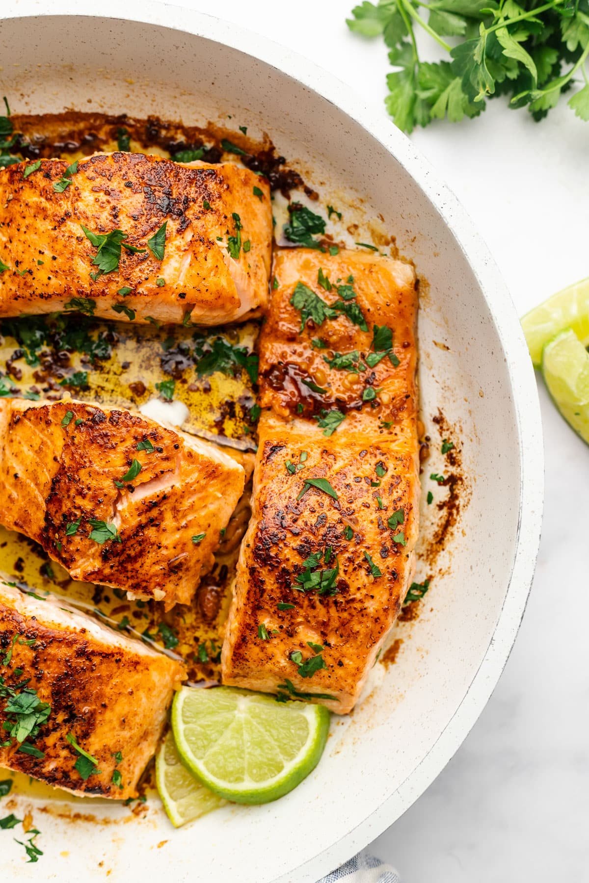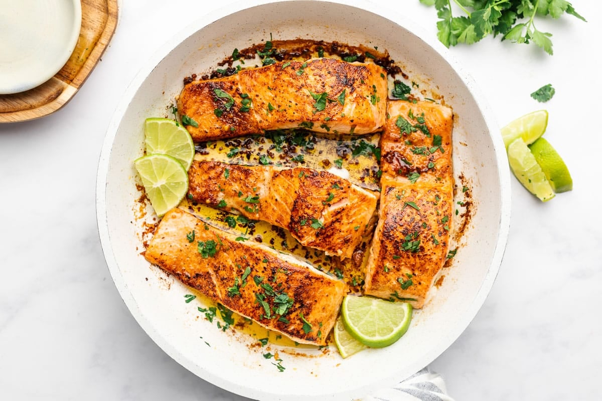 While there are plenty of ways to make delicious salmon (I have great recipes for both the air fryer and oven), pan searing in a hot skillet is my favorite way to cook it. A game changer! When you sear salmon you get a crust on the outside that’s so satisfying with the tender inside of the fish.