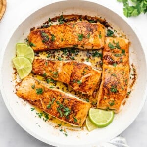 Carefully flip the salmon so skin side is now down. A fish spatula works well for this job because its very flexible, but any spatula will do the job. Add ghee, lime juice, and minced garlic to the bottom of the pan. Sautรฉ for another few minutes, until salmon is opaque. Sprinkle parsley over the salmon when you’re ready to serve! Garnish with lime wedges for an extra special presentation.
