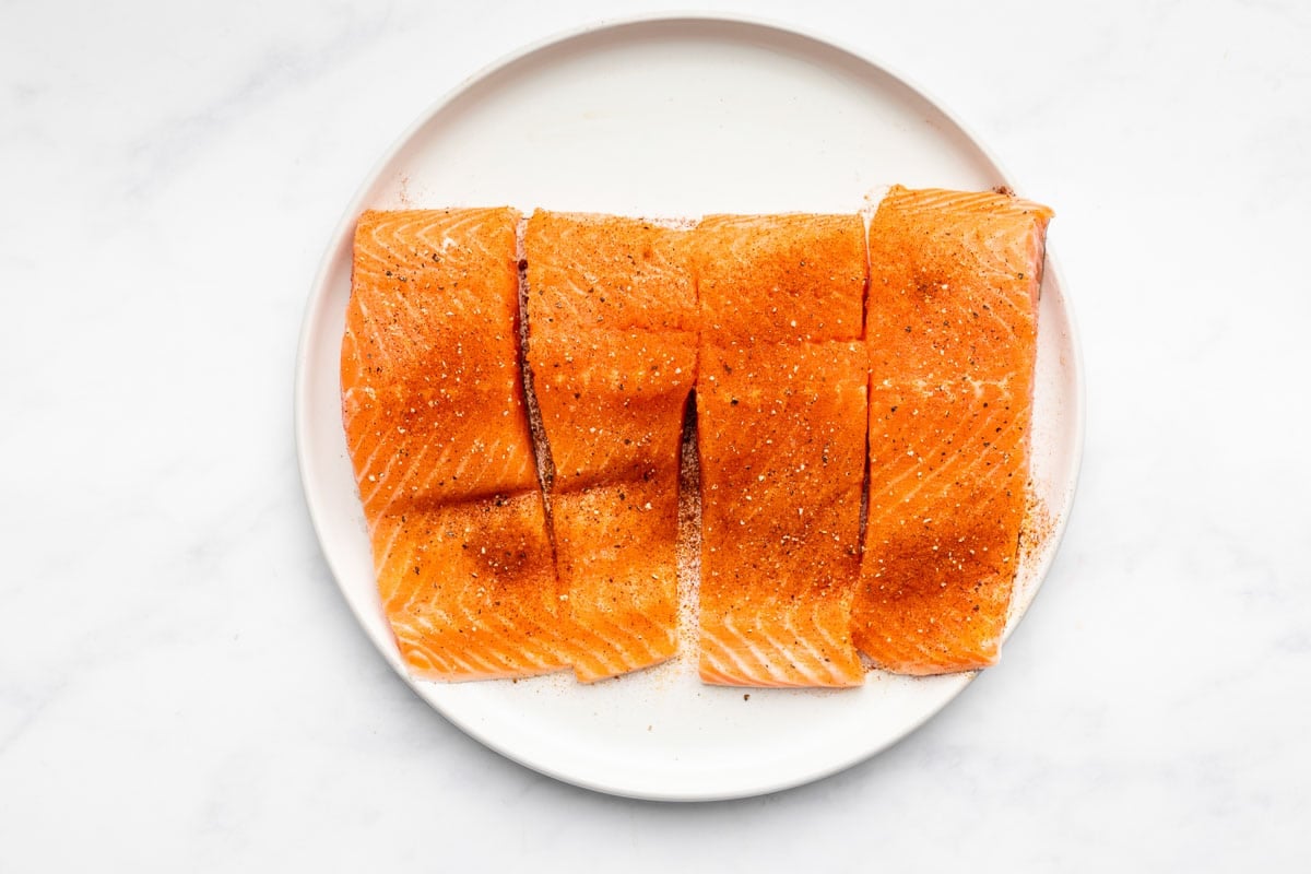 - Salmon: I prefer wild salmon over farmed salmon but what kind of salmon you use is up to you. Both fresh and frozen salmon fillets work. If using frozen let them thaw completely first. We want our salmon to be room temperature when you cook it so the inside will cook evenly. You may also opt for fillets that have skin on one side or fillets without skin.