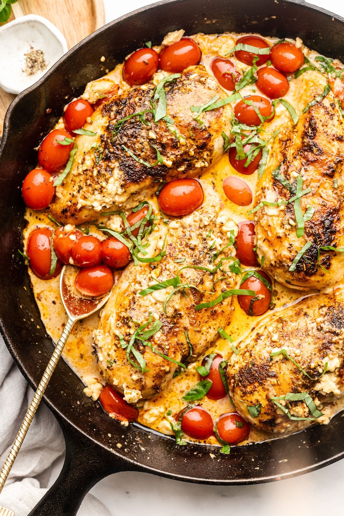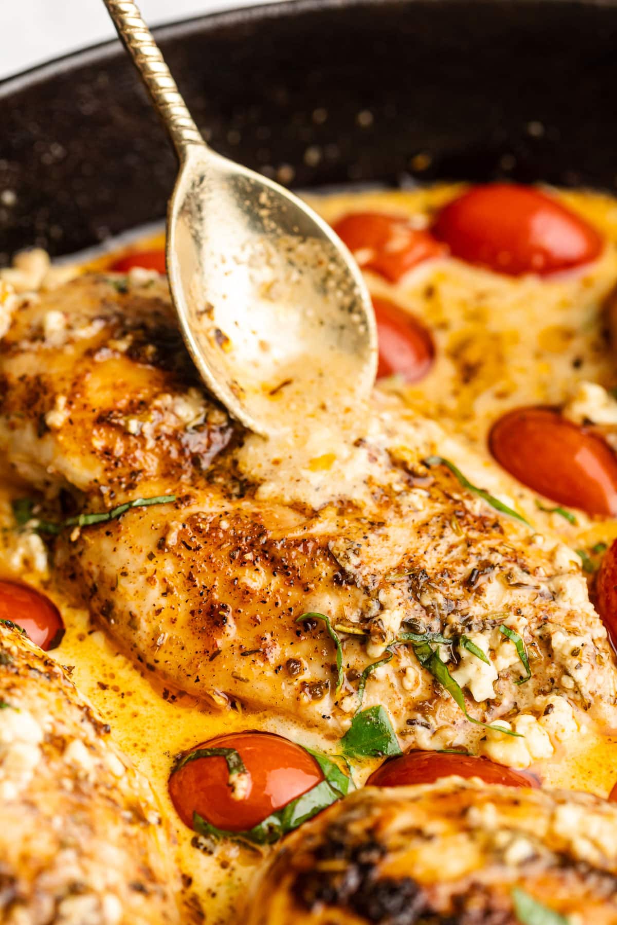 - Remove chicken from skillet and set aside. Use a fork or spoon to stir the feta and tomatoes into the sauce. Add the chicken back to the skillet and spoon sauce over top. Top everything with thinly sliced fresh basil.