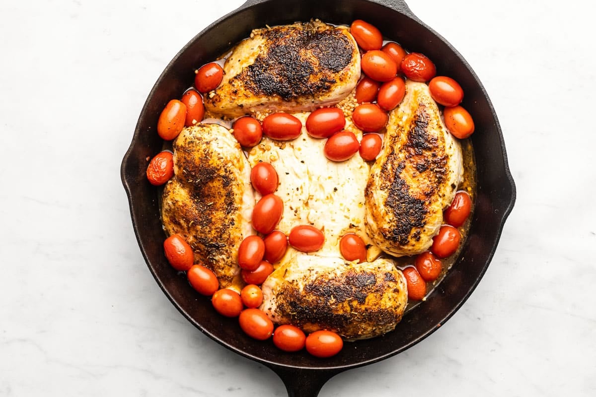 - Add oil to cast iron skillet on the stovetop. Heat to medium-high heat. Once skillet is hot, add all 4 chicken breasts to the oil. Sear until browned, about 4 to 5 minutes. Chicken will not be fully cooked. We're just looking for some good browning at this step. Flip. Sear the other side. (This is more oil than you need to brown the chicken but we want to get that oil flavorful with the chicken juices because it will become incorporated into the sauce.)