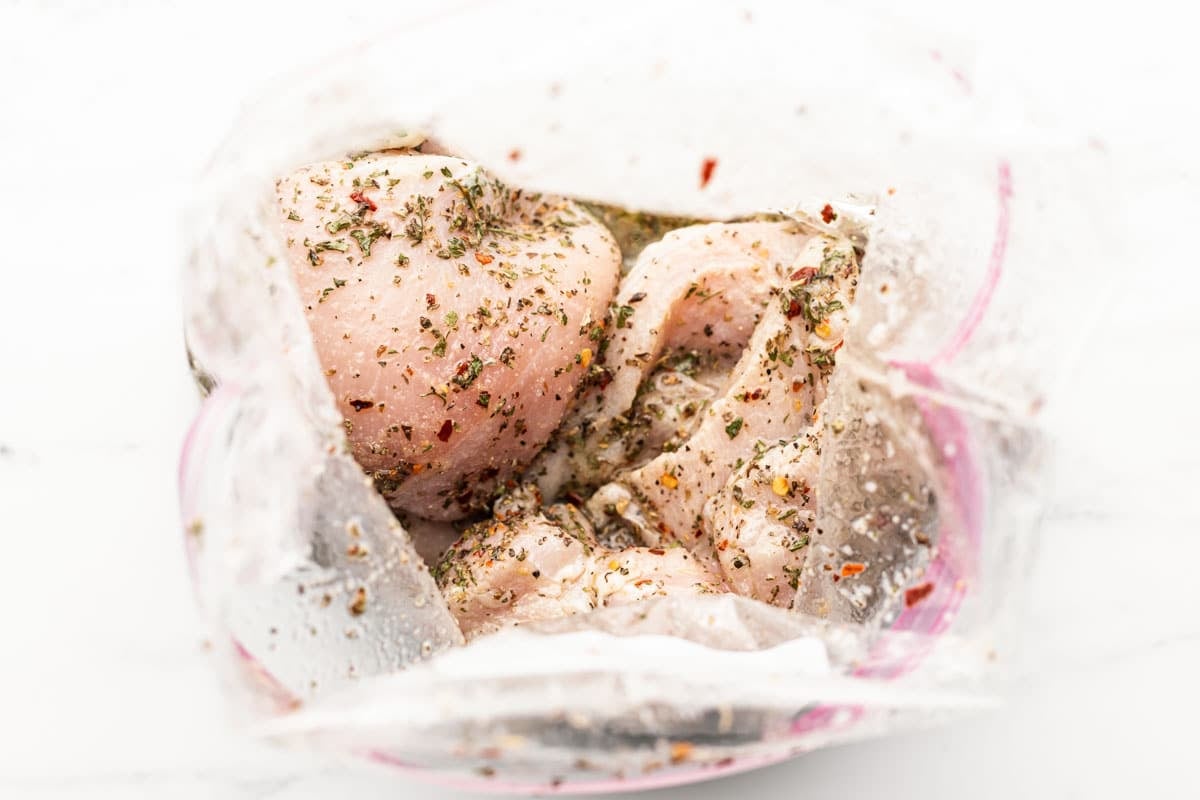 - Place your chicken breasts or thighs in a gallon Ziploc bag with all ingredients for the Lemon Herb Marinade. Seal the bag, squeezing out any excess air. Let the chicken marinate for at least one hour and up to 12 hours.