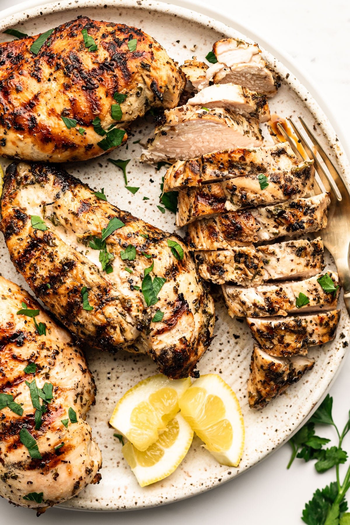 The marinade in this lemon herb chicken recipe includes olive oil so that will help prevent sticking. If you have a history of sticking problems on your grill grates then feel to add a little more olive oil directly to the grates or use a grill spray. If you try to flip your chicken and you notice itโs sticking a bit just give it another minute before flipping and the chicken will usually release better then.