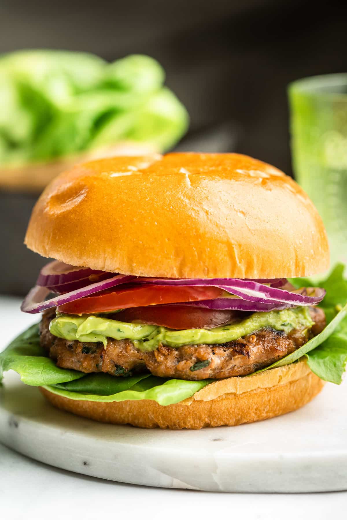 For the juiciest turkey burger and one with the most flavor, it comes down to a few things. Ground turkey can make a drier burger so it’s important to use one that’s not too lean. I recommend going with 75% or 80-85% lean ground turkey. I’d avoid using ground turkey breast as it has such little fat content. Adding a lot of fresh herbs is another great trick to keep the meat from being dense and dry. Now you’re well on your way to juicy turkey burgers!