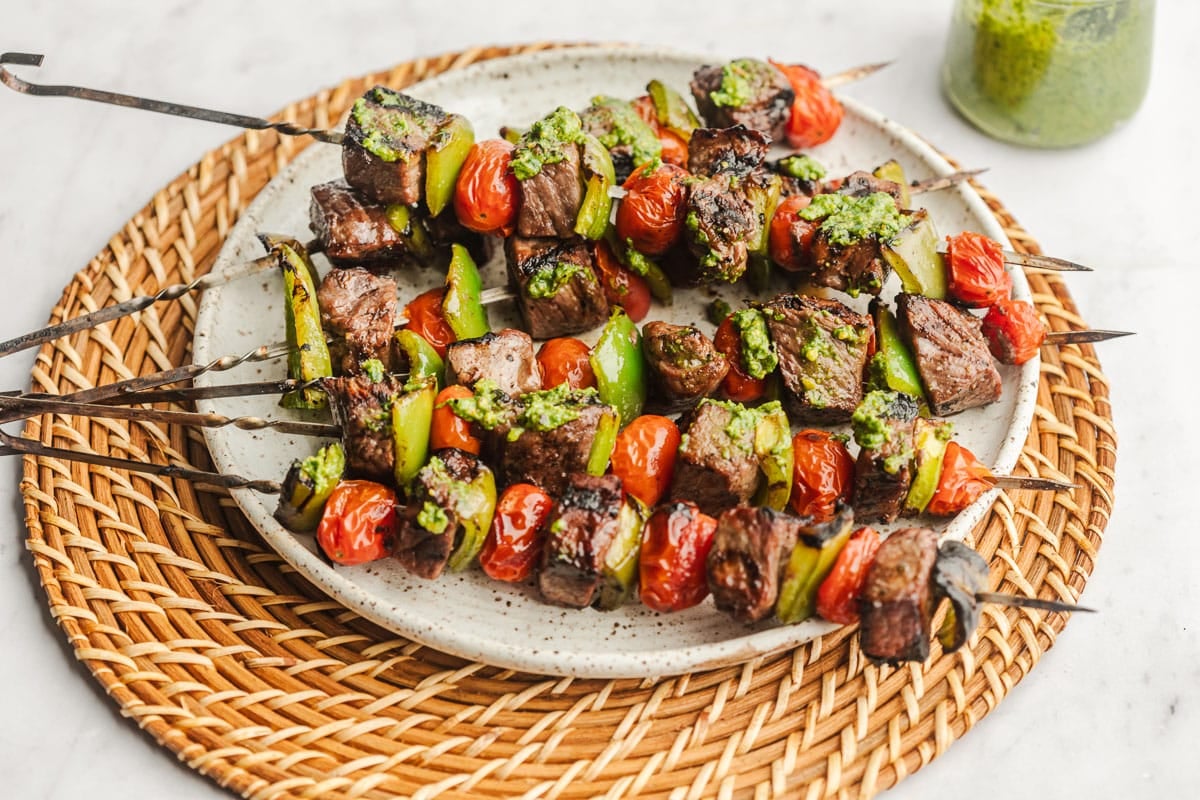 In these kabobs we’re using tomatoes and green bell pepper. The steak marinade we’re using is uncomplicated. Just two ingredients to help us achieve a more tender, flavorful steak! And then there’s the Pistachio Lemon Pesto. This pesto recipe is simple to make and packs a powerful punch. Plus it’s dairy free (no parmesan cheese!) which makes it lower in calories than traditional pesto. You can of course use a prepared pesto from the grocery store to save more time if you prefer.