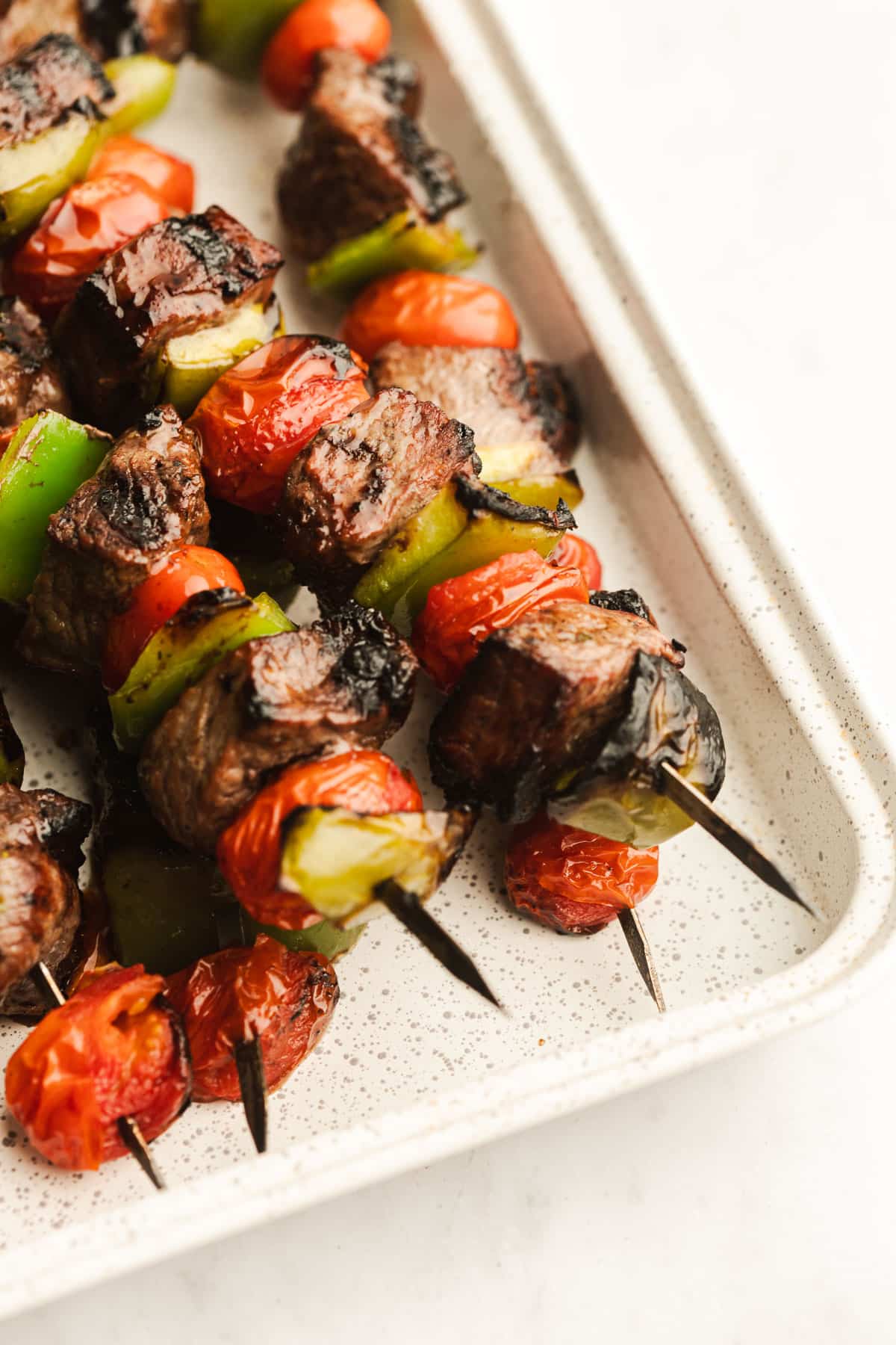Let’s talk kabobs. In my mind they’re the ultimate when it comes to healthy recipes. They cook super fast. They’re surprisingly easy but they look like you put a lot of effort in. (If you’re nervous to grill steak, kabobs will help you achieve perfect steak with less stress!) With a great marinade they can be really really flavorful. Prep and clean up is easy. I personally really appreciate how pretty they look when you serve them too. There’s just something about the colors that makes them so fun for entertaining. Kabobs are easily my favorite way to make grilled meats for guests.