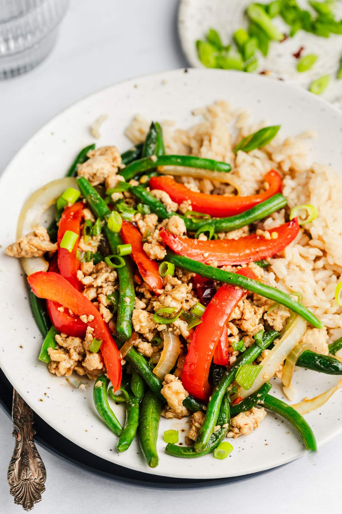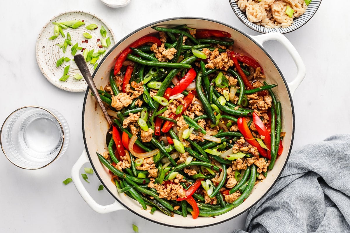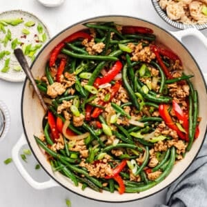 Ground chicken, green beans, bell pepper, and onion all simmer in a delicious sauce in this 30-minute stir fry! This entree is loaded with protein and can be served with rice, cauliflower rice, or even roasted potatoes.
