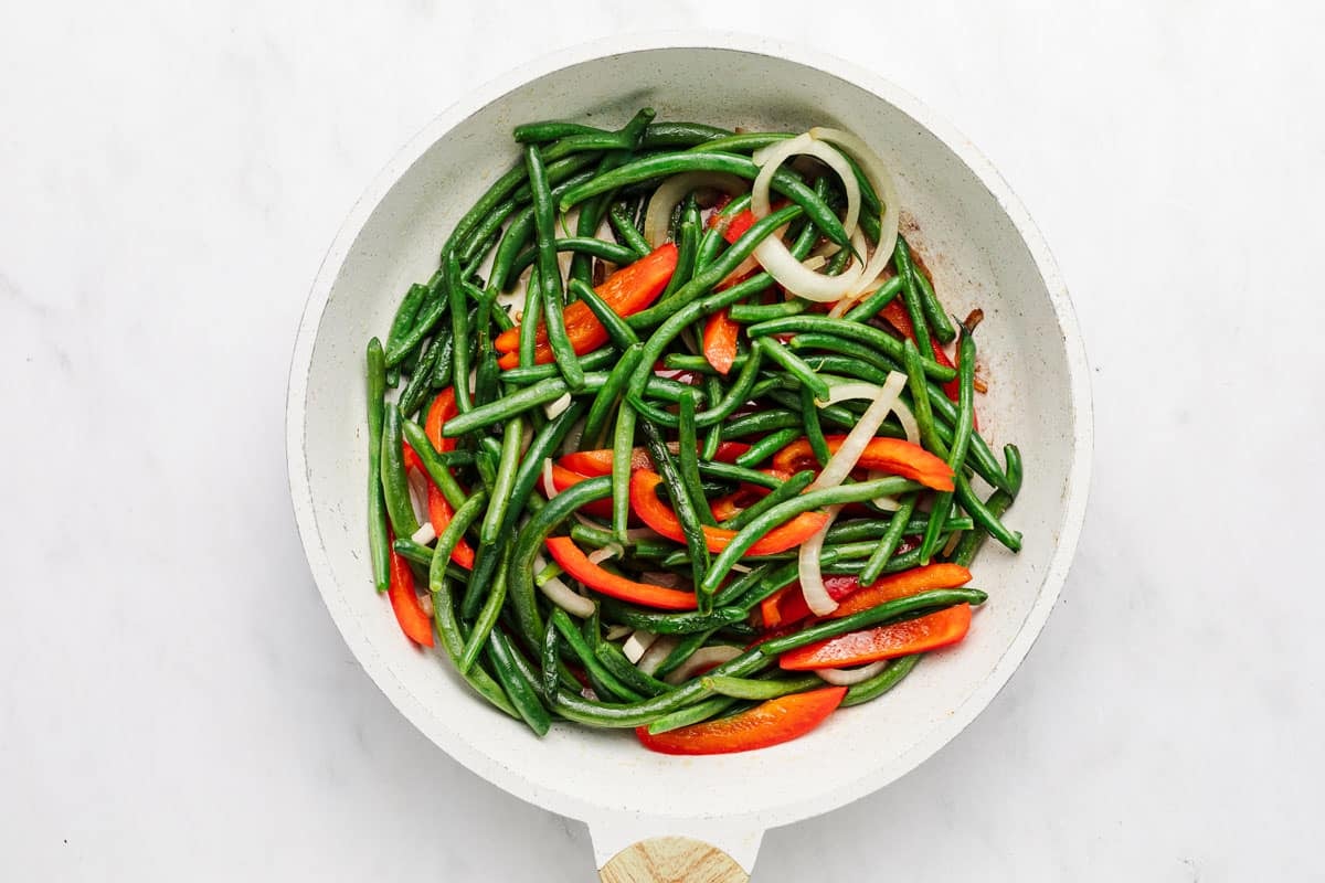 - Heat oil in a large skillet on medium-high heat. (I recommend a 12" skillet so you have room for everything.) Once oil is hot, addย the green beans, sliced onion, and sliced bell pepper. Sautรฉ uncovered for 6 to 8 minutes, stirring frequently, until green beans have some browning but are still slightly crispy. Remove the vegetables from the skillet and add to a plate. Set aside.