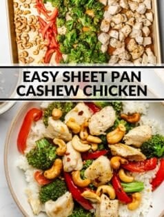 This easy sheet pan cashew chicken is the perfect weeknight dinner. Tender chicken, crunchy cashews, broccoli, red pepper, and the tastiest 4-ingredient sauce ever. What’s not to love?!