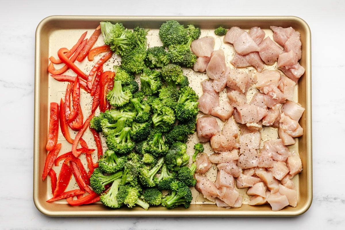 Dice chicken into bite-sized pieces. Spread in a single layer on one side of a large baking sheet. For easy clean up line your pan with parchment paper. (Parchment paper is not a requirement.)