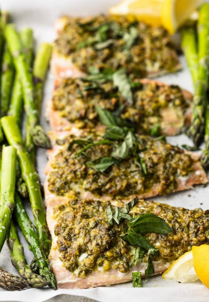 This Sheet Pan Pistachio Herb Crusted Salmon & Asparagus is an incredible restaurant quality meal in about 20 minutes! The crust is crunchy, salty, and very lemony. You’re going to want it on everything.