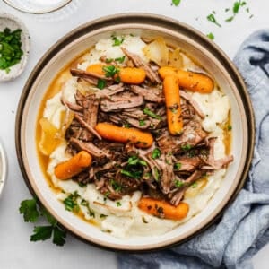 My favorite part of pot roast is all that yummy gravy and it feels like a waste to not serve everything over creamy mashed potatoes. If you feel the same you have two options: (1) just prepare the pot roast without the potatoes and make mashed potatoes separately or (2) cook the potatoes in the slow cooker with the pot roast and when everything is done, pull them out and use the cooked potatoes to make mashed potatoes.
