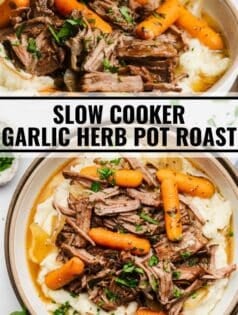 This pot roast cooks in the slow cooker with carrots, onions, and an incredibly delicious garlic herb gravy! The finished meat is fall apart tender and has so much flavor. It truly is the perfect pot roast! Serve over mashed potatoes (or add the potatoes to the slow cooker if you prefer) for a complete meal.