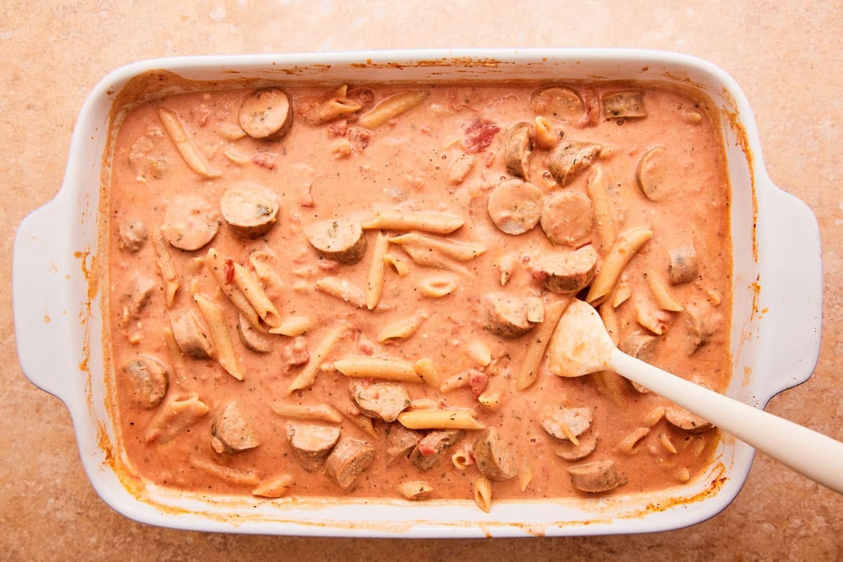The sauce we’re making here is a simple combination of canned crushed tomatoes, canned diced tomatoes, water, cream cheese, and minced garlic. It’s delightfully flavorful without any fuss. Chicken sausage and melted mozzarella make this one pot meal the ultimate dinner. It’s perfect for feeding your hungry family or storing in the fridge for meal prep. I really can’t wait for you to try this!