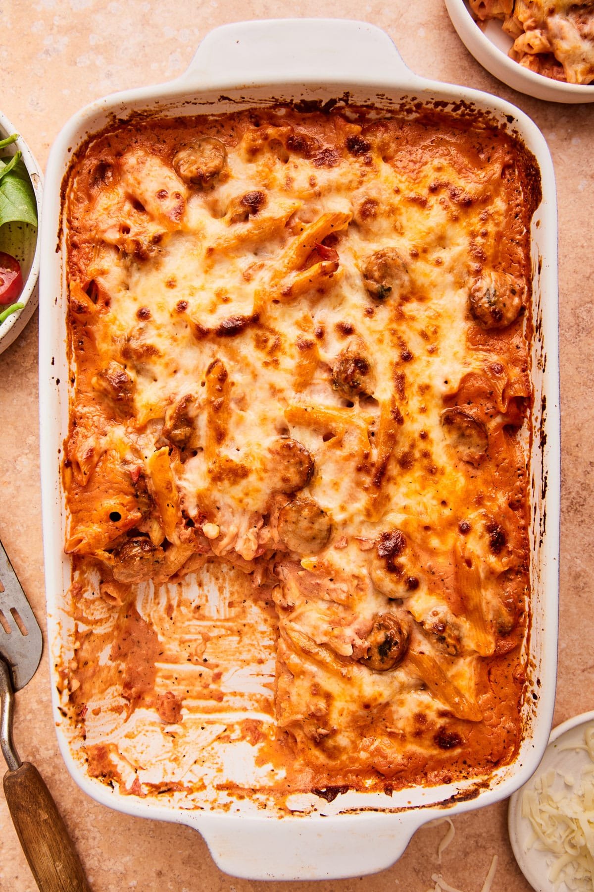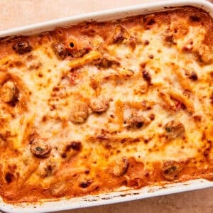 This dump and bake one pot pasta is so easy and so very delicious! The penne cooks with all the other ingredients to make it the simplest dish ever. Pasta, tomato sauce, sausage, and mozzarella – everyone loves this cozy meal!
