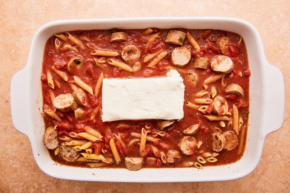 - Add the penne pasta, sliced chicken sausage, canned crushed tomatoes, canned diced tomatoes, water, minced garlic, Italian seasoning, salt, and black pepper. Stir. Place the block of cream cheese in the center.