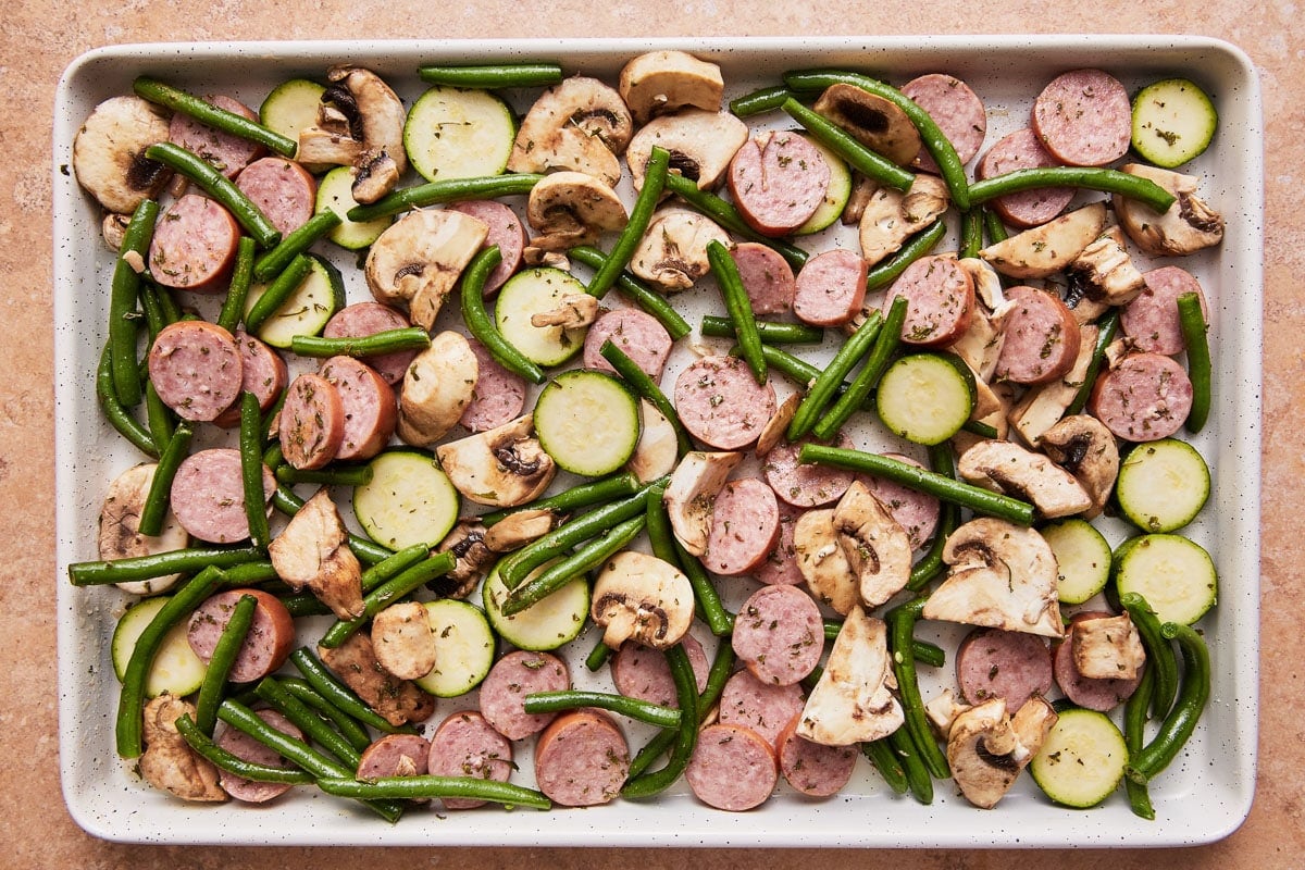 - Spread the sausage, zucchini, green beans, and mushrooms on the baking sheet. Drizzle with oil. Sprinkle dried parsley, garlic powder, onion powder, salt, and pepper over everything. Stir so everything is well seasoned. Spread sausage and veggies in a single layer after stirring.