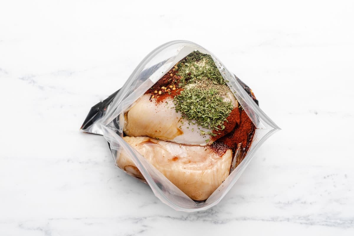 - Add chicken and all marinade ingredients to a gallon ziploc bag. (If using chicken breasts that are quite thick, slice horizontally to create thin cutlets. This helps us cook the chicken faster and gets us better browning on all sides.) Squeeze out excess air and zip closed. Lay flat, spreading the marinade inside the bag so that it's distributed evenly around the chicken. Let marinate for a minimum of 1 hour. I prefer to let it marinate for several hours or overnight if possible.