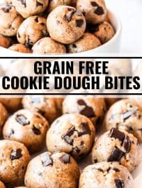 These cookie dough bites are grain free, egg free, incredibly easy, and ready in under 10 minutes. Perfect for a quick snack or dessert!