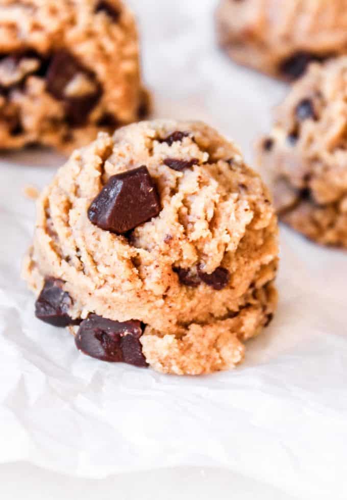 He’s already a fan of my No Bake Chocolate Chip Cookie Balls and No Bake Chocolate Cashew Cookie Balls which have a similar texture to cookie dough, but I wanted to create a treat that’s truly designed to taste like cookie dough. And of course I kept it to just a few ingredients!