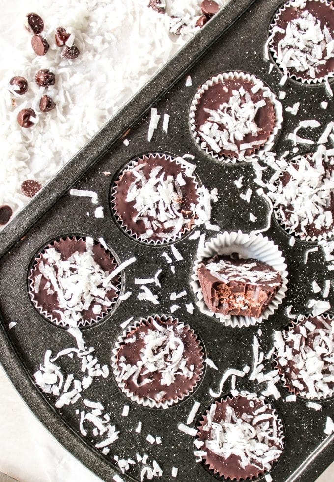 - Divide 1/3 cup coconut flakes between each cup and add to the top of the chocolate.
