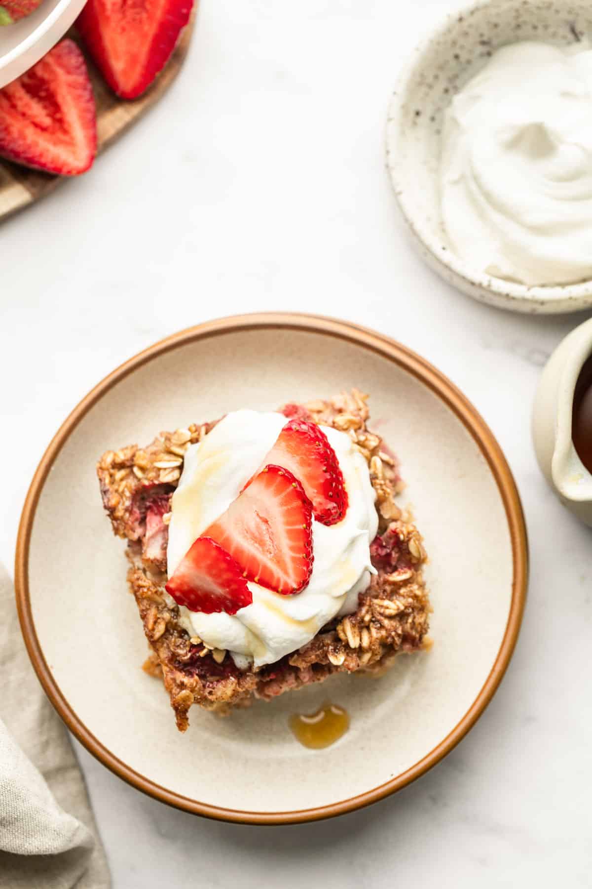 Scoop it into bowls or if you’re feeling fancy (and who isn’t?) slice into squares and top with whipped cream, fresh strawberry slices, and extra syrup.