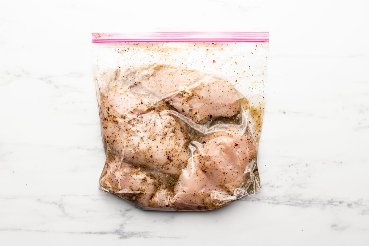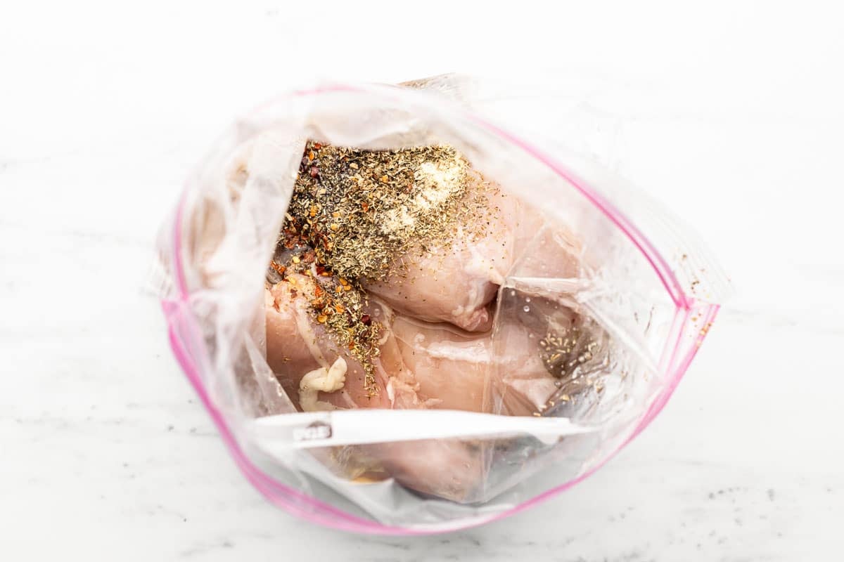 - Place your chicken breasts in a gallon Ziploc bag with all ingredients for the Easy Homemade Italian Dressing. Seal the bag, squeezing out any excess air. Let the chicken marinate for at least one hour and up to 12 hours.