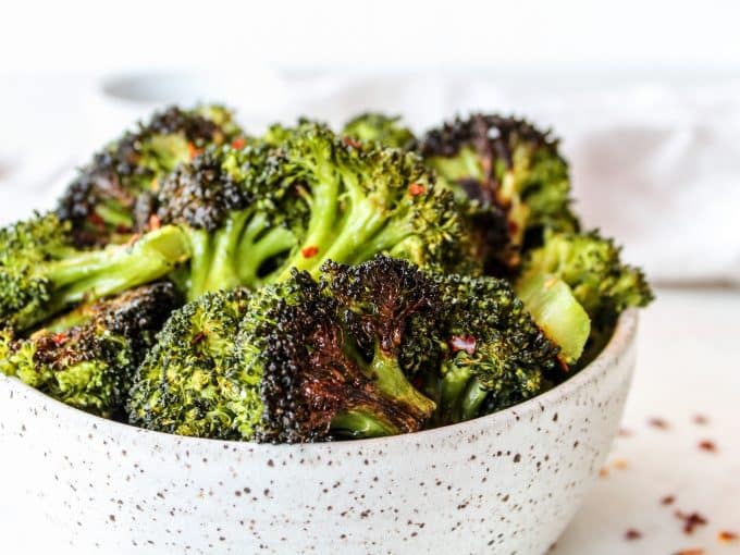 Roast fresh broccoli with olive oil, salt, and crushed red pepper for a deliciously quick side dish! This is the side I make and crave the most often. If you enjoy some heat you’ll love this!