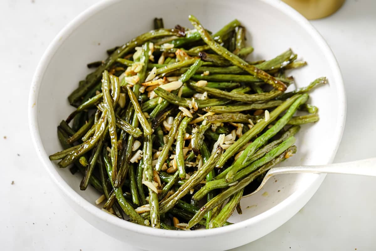 This is my spin on green beans almondine, a classic french side dish and a great way to elevate regular green beans. The name might sound fancy but the cooking process is easy. In this recipe we’re roasting our green beans to really bring out the flavor.