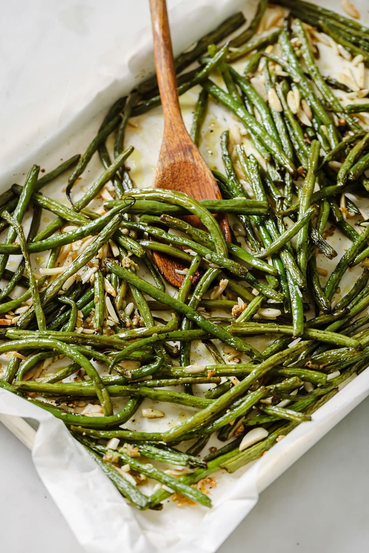 Roasting is hands down the best way to make veggies. It’s easy, the cook time is short, and every vegetable just comes out tasting better. Roasting green beans in particular makes them tender with a little char. Those browned bits are absolutely delicious! Almonds also get a glow up when they’re roasted. Raw almonds can be a little bland but toasting them until golden brown is a whole other story. Suddenly the flavor is stronger! And crunchy almonds pair beautifully with the softness of the green beans.
