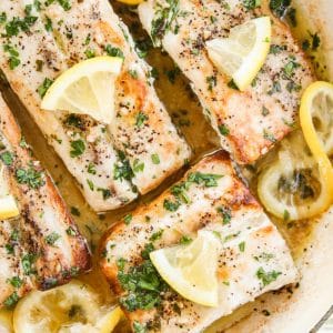 This lemony fish is perfect with roasted potatoes or rice and a green vegetable. I suggest my Herb Roasted Brussels Sprouts and Broccoli. I also love it over angel hair pasta. (I wouldn’t use a thicker pasta because the sauce and flavor of the fish is very light so a bigger noodle will overpower it.)