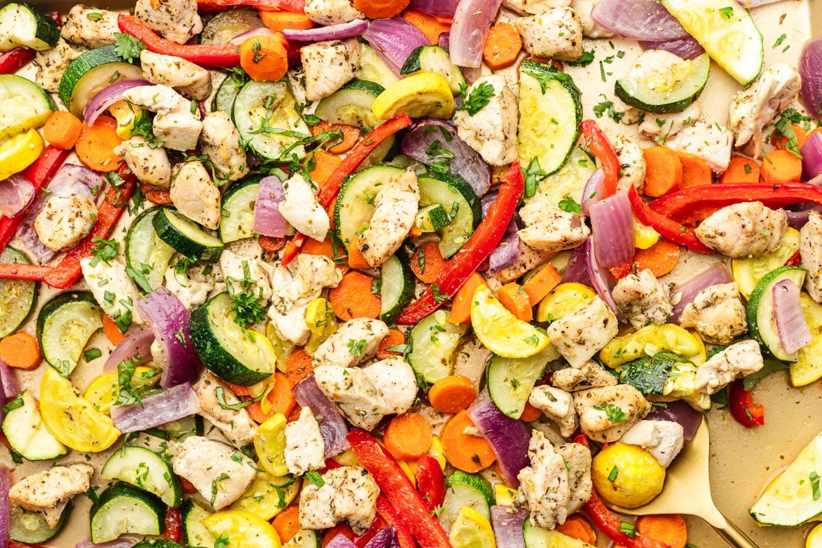 - Spread chicken, zucchini, squash, carrots, bell pepper, and red onion on the prepared baking sheet.