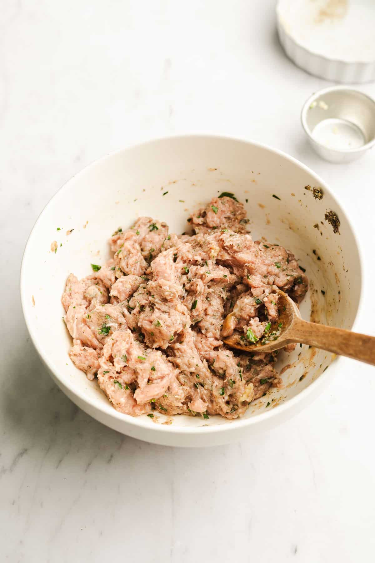 - In a large bowl, combine ground turkey, chopped parsley, egg, garlic, italian seasoning, salt, pepper, and onion powder. Use your hands to gently roll into 10 to 12 meatballs. (Ground turkey is mushy so donโt expect it to behave like ground beef. Your meatballs wonโt be very firm until theyโve been cooked and thatโs okay.)