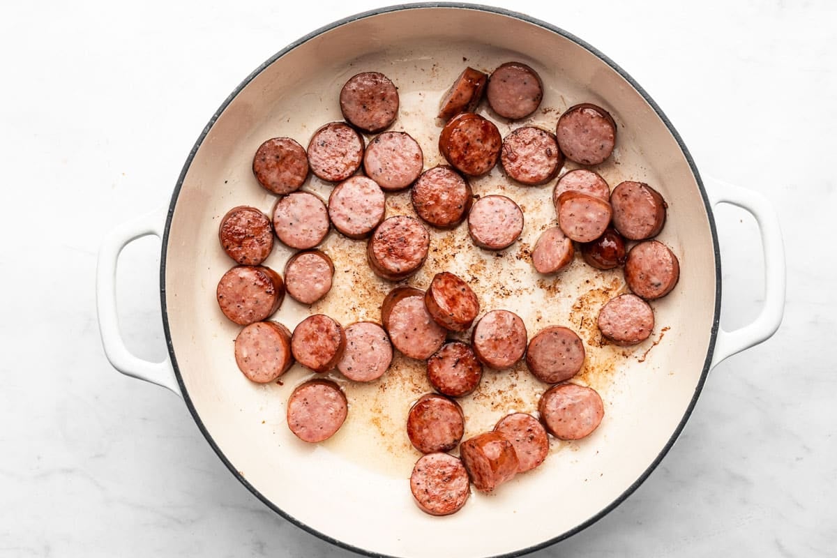 - Heat 1 tablespoon of olive oil in a large skillet (I use my 12" for this recipe) over medium-high heat. Once the oil is hot, add sliced sausage. Sautè, flipping sausage frequently, for 1 to 2 minutes or until sausage slices have some browning. Remove from pan and set aside.